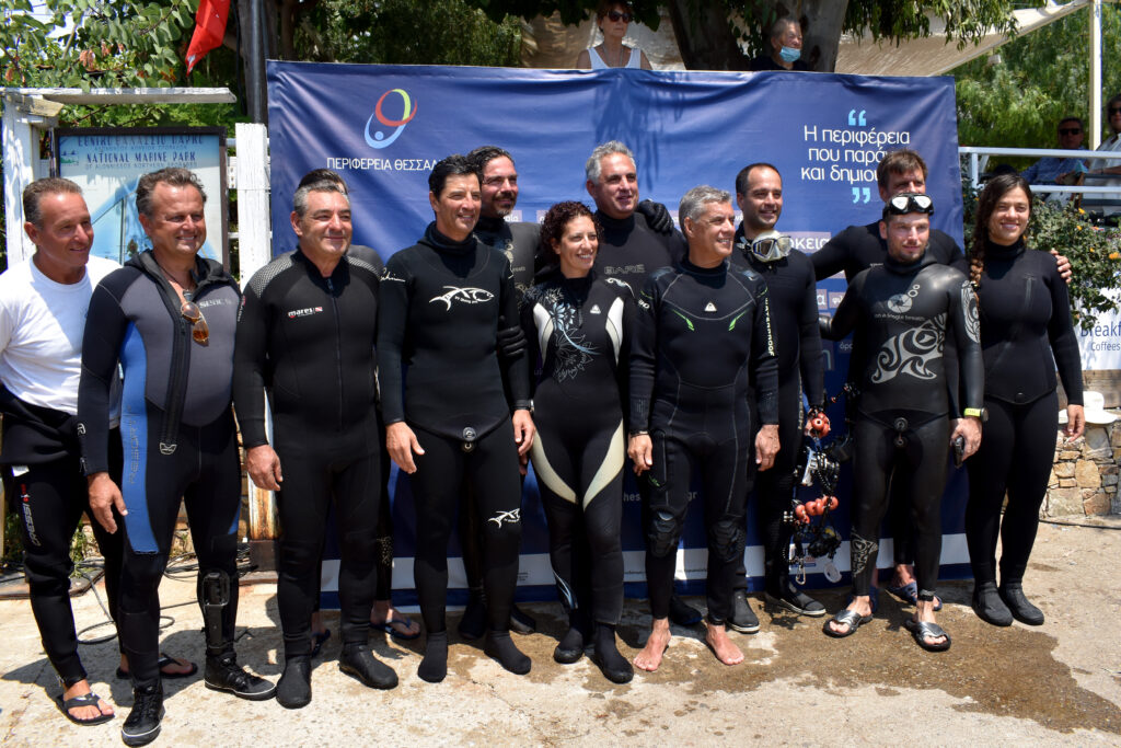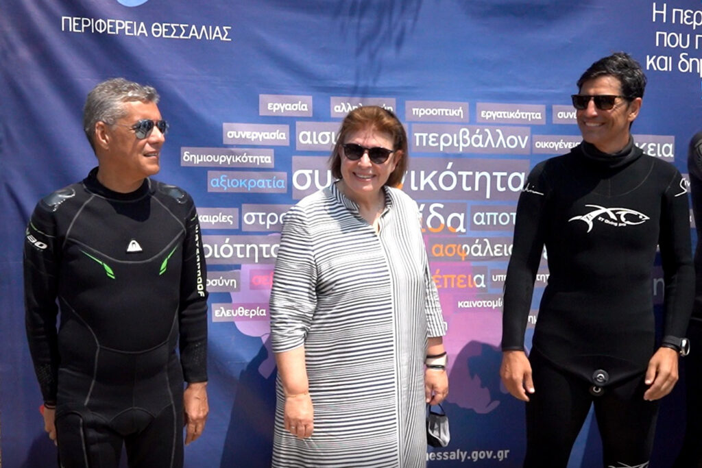 Με εντυπωσιακό τρόπο έκοψαν την κορδέλα στα καταγάλανα νερά του Αιγαίου και σε βάθος 25 μέτρων, ο περιφερειάρχης Θεσσαλίας Κώστας Αγοραστός και ο δημοφιλής τραγουδιστής Σάκης Ρουβάς, σύμφωνα με το ΑΠΕ-ΜΠΕ, οι οποίοι καταδύθηκαν υπό τα χειροκροτήματα της υπουργού Πολιτισμού Λίνας Μενδώνη, που παρακολουθούσε από απόσταση αναπνοής από σκάφος την πρωτόγνωρη εμπειρία των εγκαινίων του υποβρύχιου μουσείου του ναυαγίου της Περιστέρας.