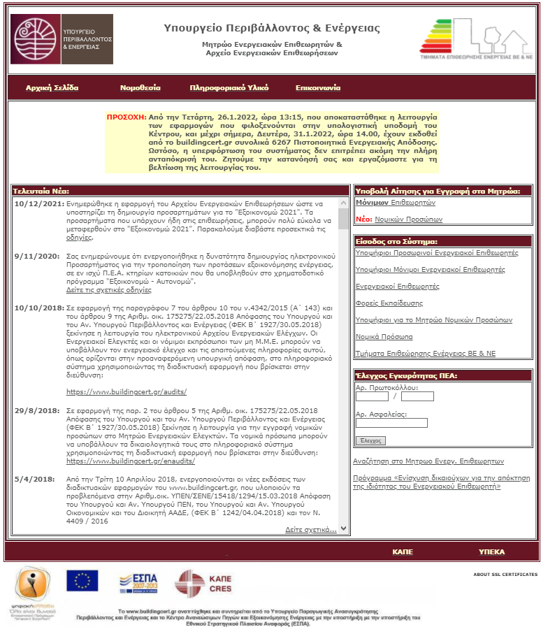 Είναι μάλιστα χαρακτηριστικό ότι η ιστοσελίδα buildingcert.gr, που φέρει τα λογότυπα του ΥΠΕΝ και του αρμόδιου τμήματος Επιθεώρησης, έχει στο υποσέλιδό του τα λογότυπα του ΕΣΠΑ 2007-2013 (!!!!) και του προγράμματος «Ψηφιακή Ελλάδα» Ενδεικτικό του γεγονότος ότι δημιουργηθήκε προ μίας δεκαετίας και βάλε και ότι έκτοτε δεν έχει γίνει επένδυση για την ανανέωση ή τον εκσυγχονισμό του!!!!