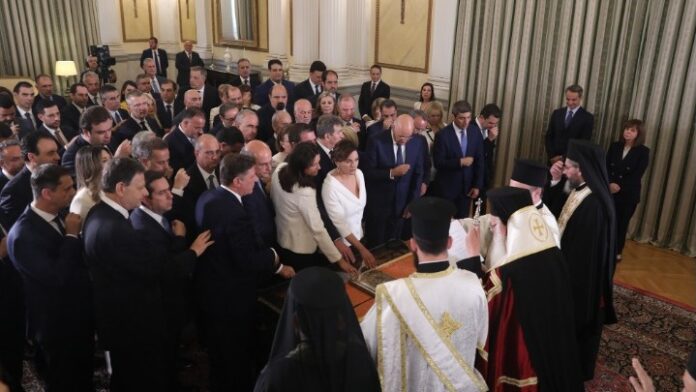 Ενώπιον της Προέδρου της Δημοκρατίας Κατερίνας Σακελλαροπούλου και παρουσία του πρωθυπουργού Κυριάκου Μητσοτάκη, ορκίστηκαν πριν από λίγο από τον αρχιεπίσκοπο Αθηνών και πάσης Ελλάδος Ιερώνυμο, τα μέλη της νέας κυβέρνησης.