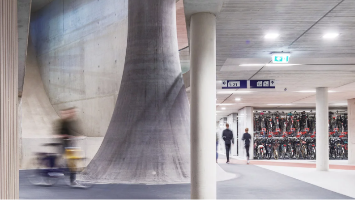 Το ολλανδικό αρχιτεκτονικό γραφείο εστίασε σε τρεις πτυχές: ευκολία, ταχύτητα και ασφάλεια. Ο χώρος είναι διαμορφωμένος σε τμήματα πάρκινγκ και διαδρόμους, σημειωμένους με κόκκινο χρώμα ώστε να υποβοηθάται η πλοήγηση των ποδηλατιστών μέσα στο γκαράζ, χωρίς να πέφτουν ο ένας πάνω στον άλλον. Σε τρία επίπεδα, οι διάδρομοι, με ράμπες επιβράδυνσης, επιτρέπουν στους ποδηλατιστές να κινηθούν από τη θέση στην οποία έχουν παρκάρει το δίκυκλο τους στο κατώτατο επίπεδο ως την επιφάνεια.