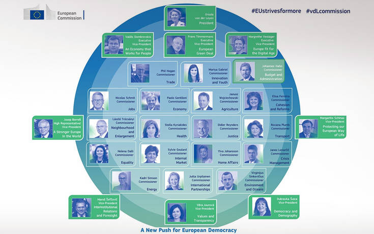 Πηγή Εικόνας: ΑΠΕ-ΜΠΕΤο νέο σχήμα των Επιτρόπων που εισάγει η Ούρσουλα φον ντερ Λάιεν διαθέτει 8 αντιπροέδρους, ένας εκ των οποίων είναι και ο Έλληνας Μαργαρίτης Σχοινάς, ο οποίος αναλαμβάνει το χαρτοφυλάκιο της προστασίας του ευρωπαϊκού τρόπου ζωής.