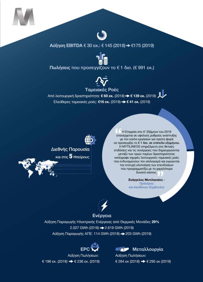 Σχολιάζοντας τα Οικονομικά Αποτελέσματα, ο Πρόεδρος και Διευθύνων Σύμβουλος Ευάγγελος Μυτιληναίος ανέφερε, σύμφωνα με το ΑΠΕ-ΜΠΕ, ότι «η Εταιρεία στο Α’ Εξάμηνο του 2019 επανέρχεται σε υψηλούς ρυθμούς ανάπτυξης με τον κύκλο εργασιών για πρώτη φορά να προσεγγίζει το €1 δισ. σε επίπεδο εξαμήνου. Η MYTILINEOS στηριζόμενη στις θετικές επιδόσεις και τις συνέργειες που δημιουργούνται μεταξύ των τριών τομέων δραστηριότητας κατέγραψε ισχυρές λειτουργικές ταμειακές ροές που ενδυναμώνουν τον ισολογισμό και εγγυώνται την επιτυχή υλοποίηση των επενδύσεων που προγραμματίζει με το χαμηλότερο δυνατό κόστος. »