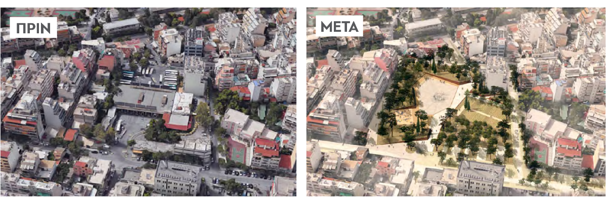 Η πρώτη πρόταση αφορά στην περιοχή του Σταθμού ΚΤΕΛ Λιοσίων και στη δημιουργία ενός μεγάλου πάρκου περίπου 28 στρεμμάτων στη θέση όπου βρίσκεται σήμερα ο σταθμός, μαζί με την πεζοδρόμηση της πλατιάς οδού Στρατηγού Δαγκλή και λίγων γύρω δρόμων και την ενοποίηση στην όλη έκταση των ελάχιστων κοινόχρηστων περιοχών. Το πάρκο θα εκτείνεται πρακτικά από τη Στρατηγού Καλλάρη στα βόρεια, μέχρι τη Λιοσίων, 430 μέτρα πιο κάτω. Το συνολικό κόστος της παρέμβασης εκτιμάται στα 20-25 εκατ. ευρώ.
