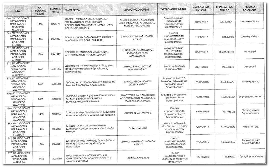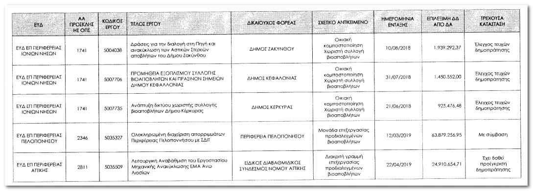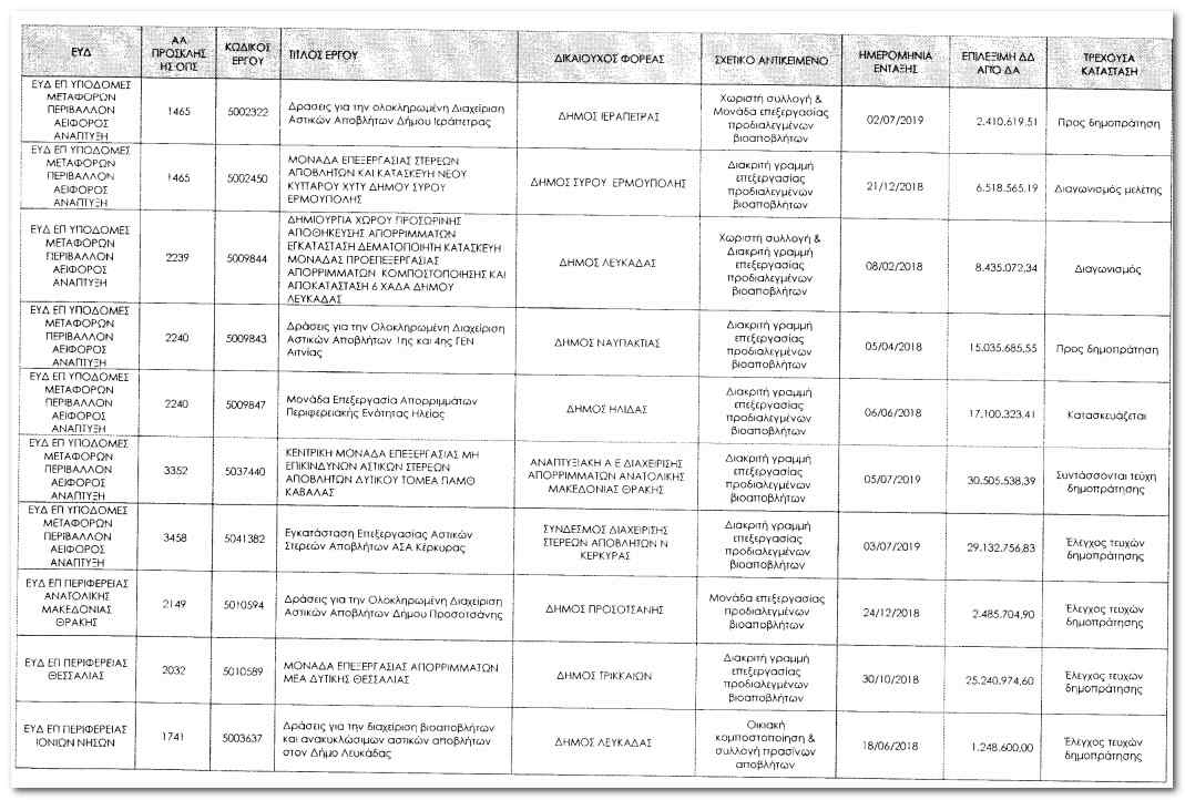 –45 εκατ. ευρώ, η οποία αφορά στη χρηματοδότηση ώριμων έργων διαχείρισης αστικών αποβλήτων (επιμερίζεται σε 15 εκατ. ευρώ σε νησιά και 30 εκατ. ευρώ στις υπόλοιπες ηπειρωτικές περιοχές της χώρας). Με την πρόσκληση να έχει λήξει, έχουν ενταχθεί τα έργα Ολοκληρωμένης Διαχείρισης 1 ης και 4ης ΓΕΝ Αιτωλοακαρνανίας (Ναυπάκτου) και η ΜΕΑ Ηλείας και βρίσκονται υπό αξιολόγηση 3 πράξεις (ΟΕΔΑ Σητείας, ΜΕΑ Χίου και ΜΕΒΑ & ΧΥΤΥ Καρπάθου), που συμπεριλαμβάνουν την επεξεργασία προδιαλεγμένων βιοαποβλήτων.