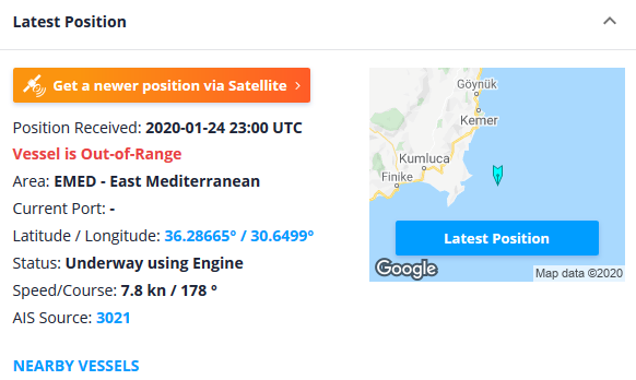 Όπως βλέπετε και στην παρακάτω φωτογραφία, το πλοίο εξακολουθεί να μην έχει δώσει σχετικό σήμα, σύμφωνα με το MarineTraffic.com.