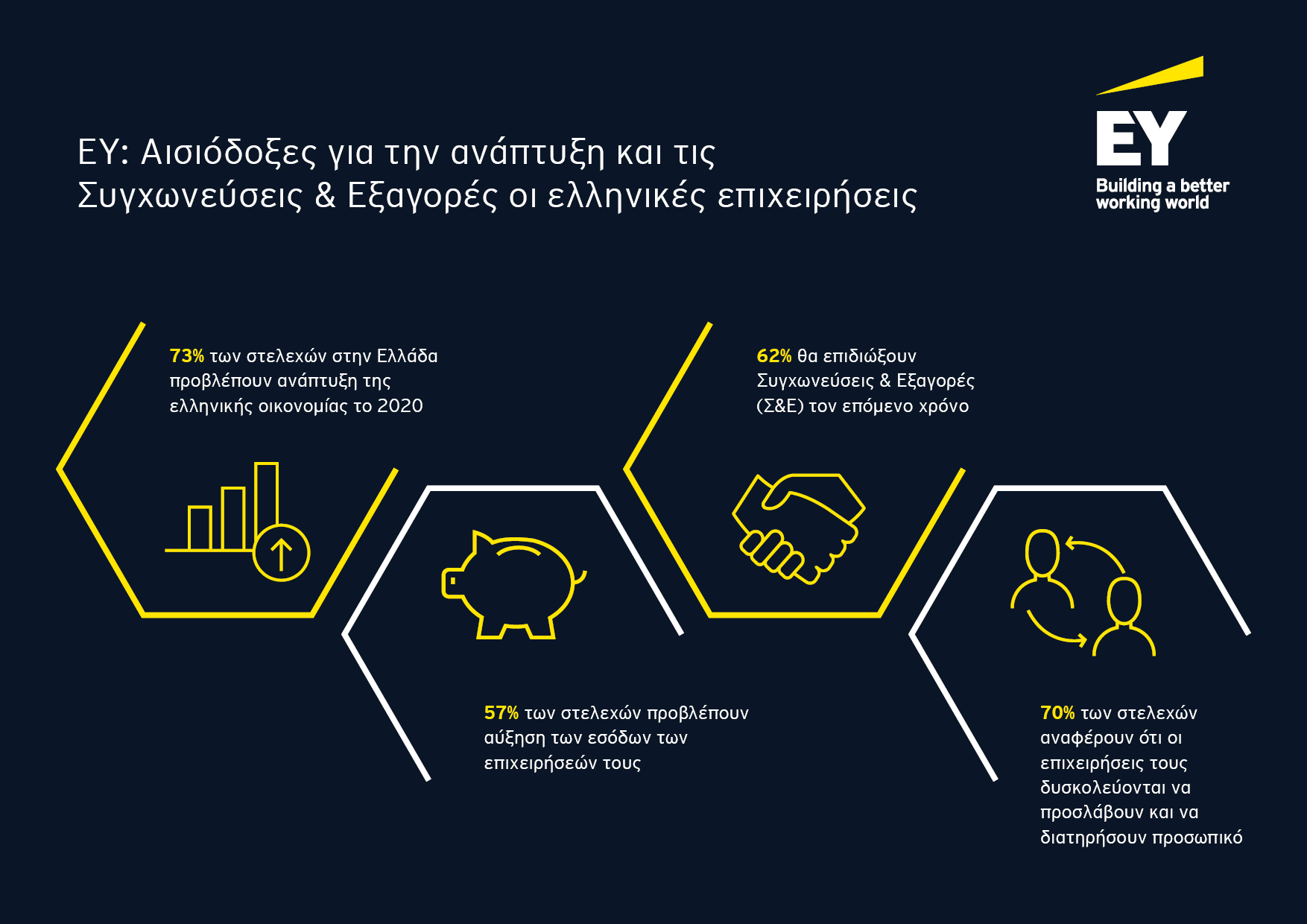 Η πολιτική σταθερότητα, η σχετικά αυξημένη εισροή ξένων επενδύσεων, η μείωση της ανεργίας, η βελτίωση των ισολογισμών των τραπεζών και η επιτυχής επιστροφή του ελληνικού κράτους στις αγορές κεφαλαίων, ενισχύουν την εμπιστοσύνη των στελεχών των ελληνικών επιχειρήσεων. Το 62% των Ελλήνων στελεχών προβλέπουν ανάπτυξη της παγκόσμιας οικονομίας, ενώ ένα ακόμη υψηλότερο ποσοστό, της τάξης του 73%, εκφράζουν αισιοδοξία για την ανάπτυξη της εγχώριας οικονομίας μέσα στο 2020. Αυτό προκύπτει από την τελευταία έκδοση του Global Capital Confidence Barometer της ΕΥ, που καταγράφει την εμπιστοσύνη των στελεχών στις οικονομικές προοπτικές και εντοπίζει τις τάσεις και τις πρακτικές των διοικητικών συμβουλίων ως προς τη διαχείριση των κεφαλαίων.