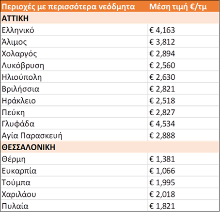 Στη Θεσσαλονίκη, αντίστοιχα, οι περιοχές όπου εντοπίζεται μεγαλύτερη πλειονότητα σε νεόδμητες κατοικίες προς πώληση, διαμορφώνονται ως εξής: η Θέρμη προηγείται με μέση τιμή € 1,381 ανά τ.μ. και ακολουθούν η Ευκαρπία με € 1,066, η Τούμπα με € 1,995, η Χαριλάου με € 2,018 και η Πυλαία με € 1,821.