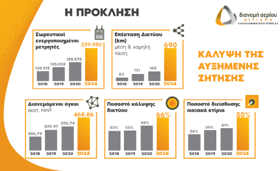 Το νέο φιλόδοξο Πρόγραμμα Ανάπτυξης της Εταιρείας Διανομής Αερίου Αττικής για την περίοδο 2020-2024, σχεδιάστηκε με αυστηρά οικονομοτεχνικά κριτήρια και περιλαμβάνει την εντυπωσιακή επέκταση του δικτύου χαμηλής και μέσης πίεσης κατά 690 χιλιόμετρα την επόμενη πενταετία και τον διπλασιασμό σχεδόν των συνδέσεων, ήτοι 240 χιλιάδες ενεργοποιημένοι μετρητές το 2024, έναντι 135 χιλιάδες το 2019, με τους διανεμόμενους όγκους να αγγίζουν τα 466 εκατ. Nm3, από 340 εκατ. Nm3, στο τέλος του περασμένου έτους.