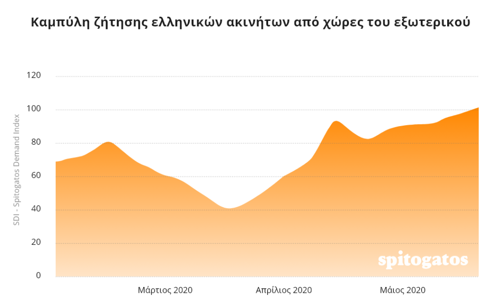 Αύξηση της ζήτησης από το εξωτερικό εμφανίζεται για τον μήνα Μάιο, σύμφωνα με τονδείκτη ζήτησης SDI, ο οποίος διαμορφώνεται από τον όγκο αναζητήσεων του Spitogatos. Πιο συγκεκριμένα, οι επισκέψειςστηΝο.1 ελληνική ιστοσελίδα αγγελιών ακινήτωναπό χρήστες που διαμένουν σε χώρες του εξωτερικού ανέβηκαν τον τελευταίο μήνα κατά 30% σε σχέση με πέρυσι.