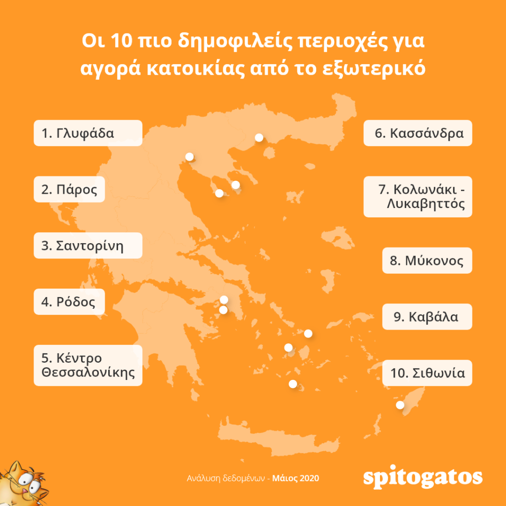 Για την ακρίβεια, ως επί το πλείστον, ακίνητο στην Ελλάδα ψάχνουν κάτοικοι από τη Γερμανία, το Ηνωμένο Βασίλειο, τις Η.Π.Α., την Κύπρο, την Αυστραλία, τη Γαλλία, την Ολλανδία, την Ελβετία και τον Καναδά ενώ οι 10 πιο δημοφιλείς περιοχές για τους χρήστες από το εξωτερικό είναι η Γλυφάδα, η Πάρος, η Σαντορίνη, η Ρόδος, η Θεσσαλονίκη, η περιοχή Κασσάνδρα στη Χαλκιδική, η ευρύτερη περιοχή που συμπεριλαμβάνει το Κολωνάκικαι τον Λυκαβηττό, η Μύκονος, η Καβάλα και η Σιθωνία Χαλκιδικής.