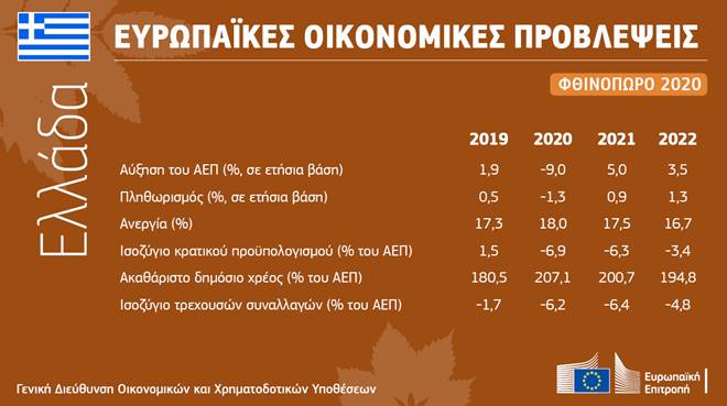 Σύμφωνα με τις φθινοπωρινές προβλέψεις του 2020, η οικονομία της ζώνης του ευρώ θα συρρικνωθεί κατά 7,8 % το 2020 και θα σημειώσει θετικό ρυθμό ανάπτυξης 4,2 % το 2021 και 3 % το 2022. Σύμφωνα με τις προβλέψεις, η οικονομία της ΕΕ θα συρρικνωθεί κατά 7,4 % το 2020 και θα σημειώσει θετικό ρυθμό ανάπτυξης 4,1 % το 2021 και 3% το 2022. Σε σύγκριση με τις θερινές οικονομικές προβλέψεις 2020, οι προβλέψεις για την ανάπτυξη τόσο για τη ζώνη του ευρώ όσο και για την ΕΕ είναι ελαφρώς υψηλότερες για το 2020 και χαμηλότερες για το 2021. Η παραγωγή τόσο στη ζώνη του ευρώ όσο και στην ΕΕ δεν αναμένεται να ανακτήσει τα προ της πανδημίας επίπεδα εντός του 2022.