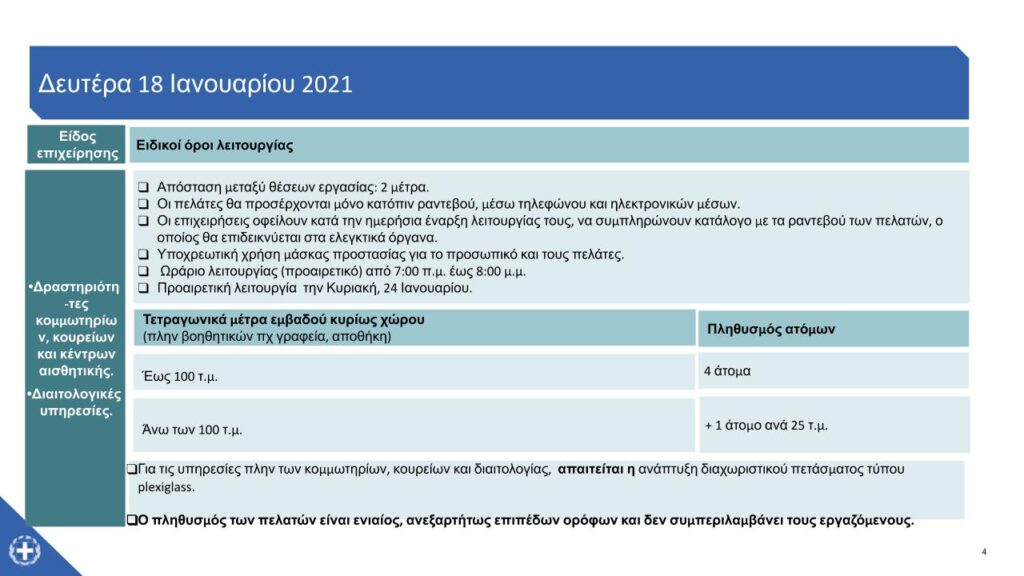 Έναρξη λειτουργίας των μέχρι τώρα κλειστών επιχειρήσεων του λιανεμπορίου και των προσωπικών υπηρεσιών: από Δευτέρα 18 Ιανουαρίου (προαιρετική λειτουργία καταστημάτων, την Κυριακή 24 Ιανουαρίου) με προαιρετικό ωράριο λειτουργίας από 7:00 π.μ. έως 8:00 μ.μ.