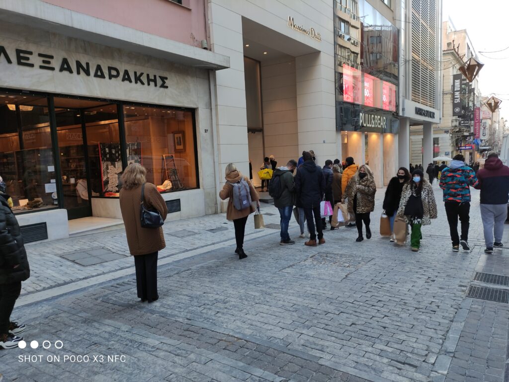 Ο πιο εμπορικός δρόμος της Αθήνας η Ερμού αλλά και άλλοι κεντρικοί δρόμοι της Αθήνας , όπως η Σταδίου, ή Πανεπιστημίου και η Πατησίων οι καταναλωτές σχημάτισαν ουρές έξω από το κατάστημα περιμένοντας τη σειρά τους για να περάσουν την είσοδο των καταστημάτων.