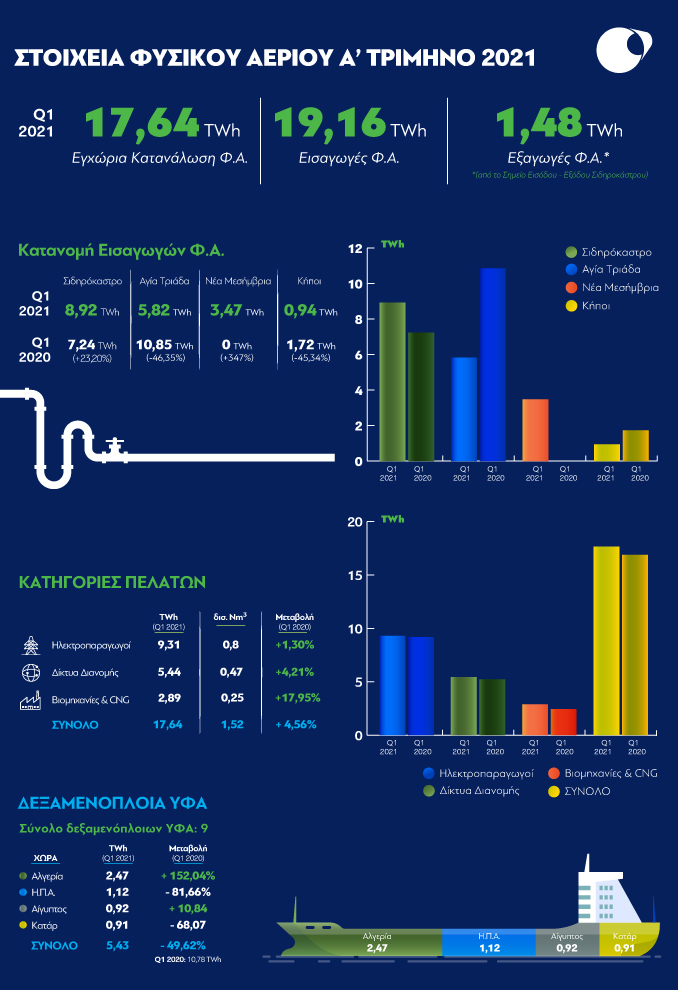 Οι εισαγωγές φυσικού αερίου ανήλθαν σε 19,16 TWh, παρουσιάζοντας μείωση από τις 19,82 TWh στο α’ τρίμηνο του 2020. Οι μεγαλύτερες ποσότητες εισήλθαν από το σημείο εισόδου Σιδηροκάστρου (8,9 TWh), το οποίο κάλυψε ποσοστό 46,57% των εισαγωγών, καταγράφοντας σημαντική αύξηση σε σχέση με το α’ τρίμηνο του 2020. Ακολούθησε ο Τερματικός Σταθμός LNG της Ρεβυθούσας (σημείο εισόδου Αγ. Τριάδα), με κάλυψη του 30,37% των εισαγωγών (5,82 TWh).