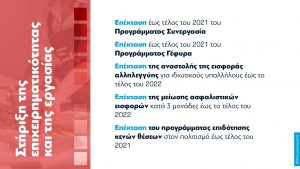 * Η ενίσχυση της επιχειρηματικότητας με σκοπό τη δημιουργία νέων θέσεων εργασίας παραμένει βασική μας προτεραιότητα. Και πλαισιώνεται σήμερα από μία νέα δέσμη μέτρων για τη ρευστότητα, τη μεγέθυνση των επιχειρήσεων και την προώθηση πράσινων και ψηφιακών επενδύσεων.
