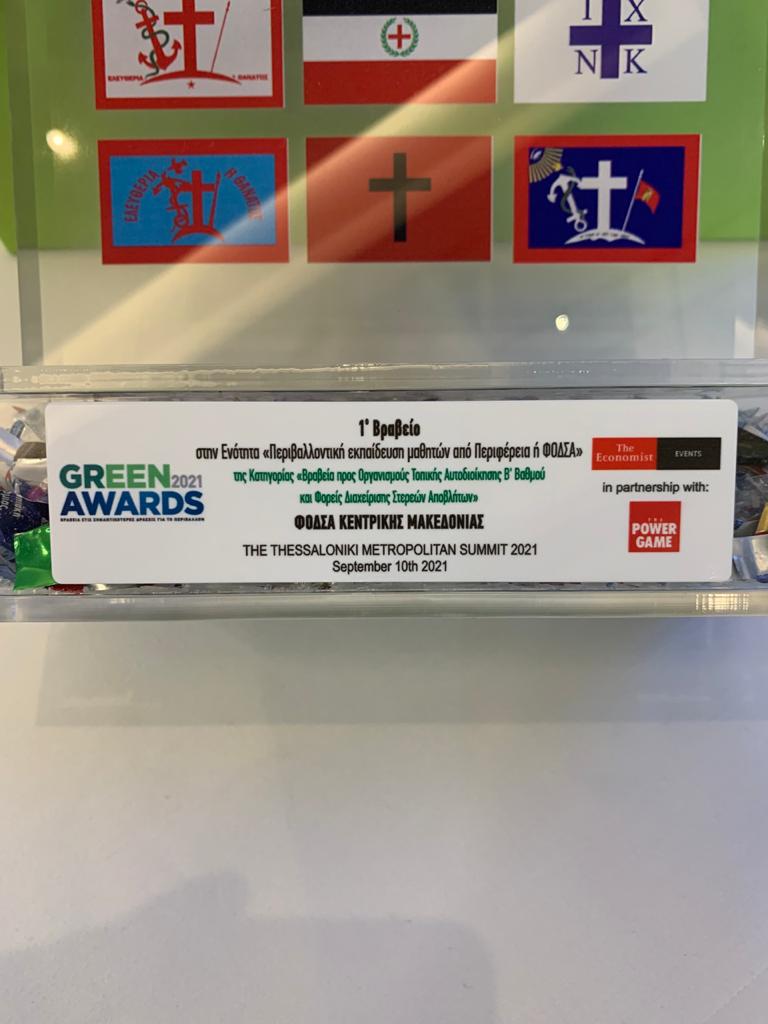 Με το πρώτο βραβείο για το Περιβάλλον GREEN AWARD 2021 στην κατηγορία «Περιβαλλοντική Εκπαίδευση μαθητών από Περιφέρεια ή ΦΟΔΣΑ» τιμήθηκε ο Φορέας Διαχείρισης Στερεών Αποβλήτων Κεντρικής Μακεδονίας, (ΦΟΔΣΑ Κ. Μακεδονίας) από τον διεθνή ενημερωτικό φορέα «The economist» σε συνεργασία με το powergame.