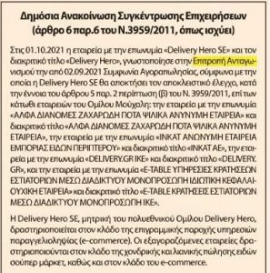 Στην εξαγορά σειράς εταιρειών που ελέγχει ο Όμιλος Μούχαλη προχωρά η εταιρία Delivery Hero, μητρική εταιρείας του e -food. Πιο συγκεκριμένα με βάση σχετική ανακοίνωση προς την Επιτροπή Ανταγωνισμού από την 1η Οκτωβρίου 2021 η εταιρεία με την επωνυμία Delivery Hero SE και τον διακριτικό τίτλο Delivery Hero γνωστοποίησε στην Επιτροπή Ανταγωνισμού την από 02.09.2021 Συμφωνία Αγοραπωλησίας σύμφωνα με την οποία η Delivery Hero SE θα αποκτήσει τον αποκλειστικό έλεγχο των εταιρειών του Ομίλου Μούχαλη.