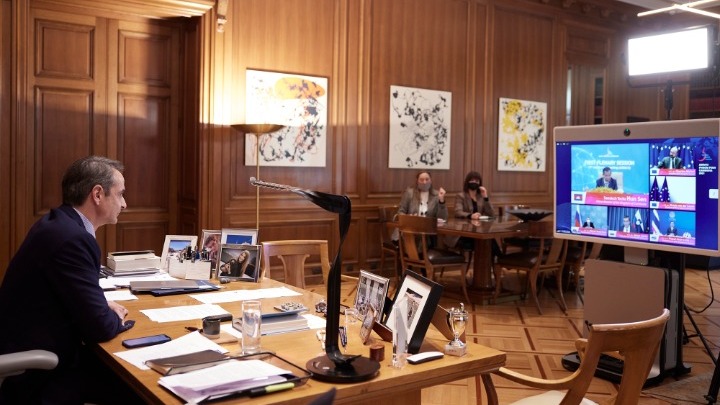 Ο πρωθυπουργός κατά τη διάρκεια της παρέμβασής του εστίασε στην παγκόσμια πρόκληση της Κλιματικής Κρίσης και παρουσίασε τις πρωτοβουλίες της χώρας μας για τον πράσινο μετασχηματισμό και την αειφόρο ανάπτυξη τόσο σε εθνικό όσο και σε διεθνές επίπεδο. Έκανε ιδιαίτερη αναφορά στην πρωτοβουλία για τα ενεργειακά «καθαρά» νησιά (πρωτοβουλία GR-eco islands), καθώς και στη σύσταση αυτόνομου υπουργείου Κλιματικής Κρίσης.