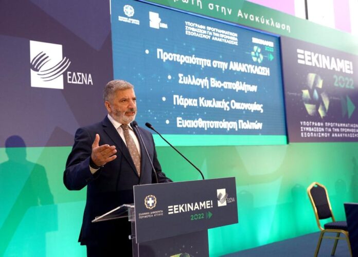«Στόχος μας είναι να το 2025 να ανακυκλώνουμε τουλάχιστον 2,5 φορές περισσότερο από όσο σήμερα και το 2030 να θάβουμε το 1/8 των απορριμμάτων που θάβονται σήμερα. Να καταστεί η Αττική Πράσινη Περιφέρεια και πρώτη στην Ανακύκλωση», τόνισε ο περιφερειάρχης Γ. Πατούλης στη διάρκεια ειδικής εκδήλωσης στο Ζάππειο όπου με τον πρόεδρο του ΕΔΣΝΑ Β. Κόκκαλη και τους αναδόχους, συνυπέγραψαν τις συμβάσεις για την προμήθεια εξοπλισμού ανακύκλωσης, ύψους 100 εκατ. ευρώ, που θα διανεμηθεί δωρεάν στους δήμους, παρουσία του υπ. Ανάπτυξης Α. Γεωργιάδη, του γεν. γραμματέα Διαχείρισης Αποβλήτων Μ. Γραφάκου, βουλευτών, δημάρχων της Αττικής και εκπροσώπων της Αυτοδιοίκησης.