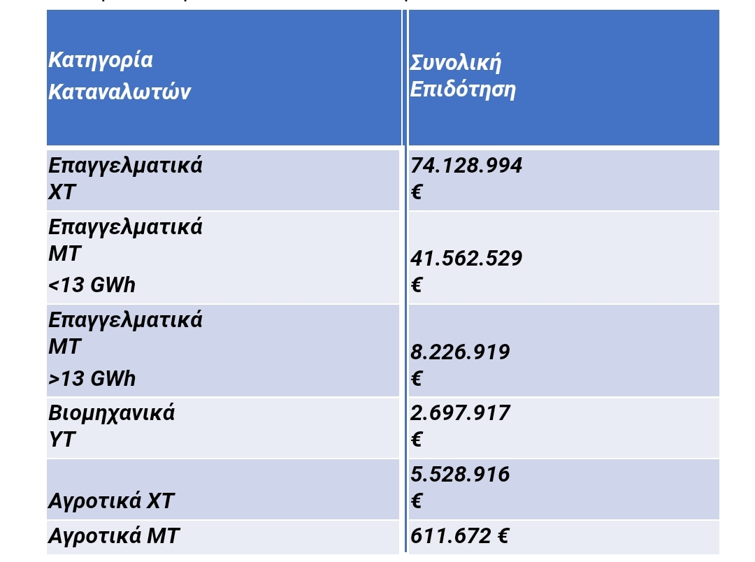 Η επιδότηση θα ανέλθει στο 50% του αυξημένου κόστους και αφορά όλη την μηνιαία κατανάλωση. Η μοναδιαία τιμή της επιδότησης ορίζεται σε 65€/MWh.