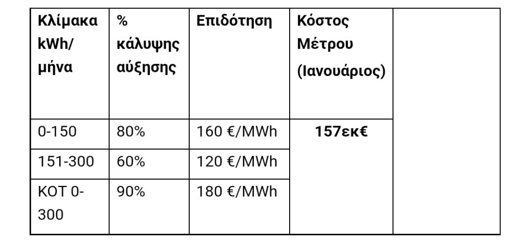 · για τις πρώτες 150 KWh κατανάλωσης ανά μήνα επιδοτούμε το 80% της αύξησης με 160 €/MWh