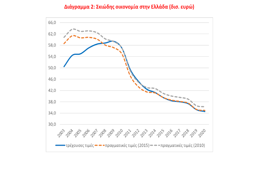 Ωστόσο, σε απόλυτα μεγέθη, η σκιώδης οικονομία μειώθηκε: «Οι μακροοικονομικές εκτιμήσεις δείχνουν ότι η σκιώδης οικονομία στην Ελλάδα ακολούθησε ανοδική πορεία έως και το 2009 (56,9 δισ. ευρώ σε τρέχουσες τιμές). Από το 2010 (έναρξη των μέτρων λιτότητας και της ελληνικής οικονομικής κρίσης) ακολουθεί πτωτική πορεία και το 2020 έφτασε στα 34,6 δισ. ευρώ».