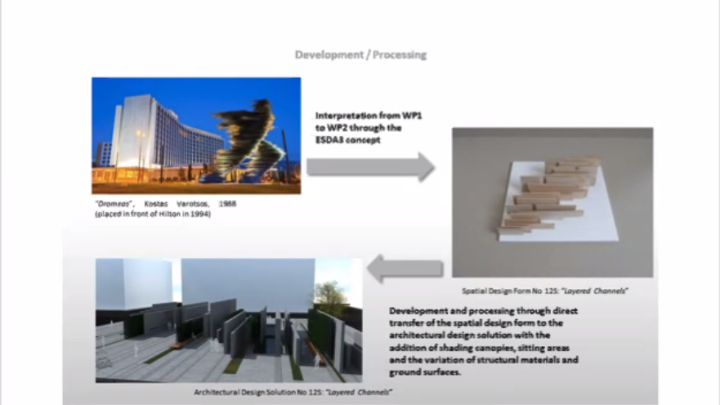 Η μεταφορά του σκίτσου στην πραγματική τρίτη διάσταση ήταν το επόμενο βήμα για την ερευνητική ομάδα ESDA3, που προχώρησε σε αυτό δημιουργώντας μία μακέτα με ξύλο τύπου μπάλσα. «Στο στάδιο αυτό αφαιρέσαμε κάποια από τα επίπεδα μεταξύ των λωρίδων, ώστε να δημιουργούνται κανάλια αέρα, δηλαδή κατά προσέγγιση η μορφή του κενού που θα καλύπτει ο αέρας. Η μακέτα απαρτίζεται από πολυάριθμες ορθογώνιες λωρίδες μπάλσα διαφορετικών και παρόμοιων μεγεθών», πρόσθεσε η ερευνήτρια, δείχνοντας στη συνέχεια τις εικόνες από την ενσωμάτωση της τρισδιάστατης μορφής σε έναν εικονικό αστικό χώρο και συγκεκριμένα σε μία πλατεία.