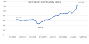 Η ανάπτυξη ολόκληρης της αγοράς εμπορευμάτων αποτυπώνεται από τον δείκτη Dow Jones Commodity Index (DJCI). Η αξία του έχει αυξηθεί σχεδόν κατά 50% τους τελευταίους 12 μήνες και περίπου 20% από την αρχή του 2022.