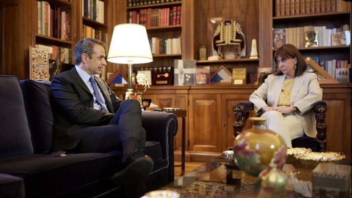 Πηγή Εικόνας: απε - μπεΟ πρωθυπουργός Κυριάκος Μητσοτάκης στις πρώτες του κουβέντες κατά τη συνάντησή του με την Πρόεδρο της Δημοκρατίας Κατερίνα Σακελλαροπούλου την ενημέρωσε για τα πρόσφατα ταξίδια του στις ΗΠΑ και το Νταβός.