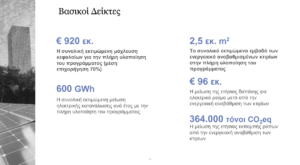 - Η μείωση της ετήσιας εκπομπής ρύπων από την ενεργειακή αναβάθμιση των κτιρίων υπολογίζεται στους 364 χιλ. τόνους co2eq.