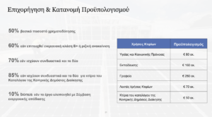 - Συστημάτων επιτόπιας παραγωγής και αποθήκευσης ηλεκτρικής ενέργειας (έως 10% του προϋπολογισμού),