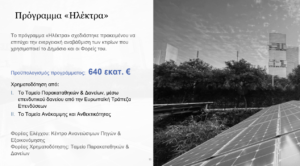 Αναφέρομαι στο πρόγραμμα «Ηλέκτρα» ύψους 640 εκατ. ευρώ με το οποίο στοχεύουμε σε εξοικονόμηση ενέργειας κατά 30% σε 2,5 εκατ. m² κτιρίων που θα αναβαθμιστούν ενεργειακά. Ο οριστικός Οδηγός του προγράμματος αναρτάται σήμερα, στην ιστοσελίδα του Υπουργείου Περιβάλλοντος και ενέργειας ενώ η ηλεκτρονική πλατφόρμα θα τεθεί σε λειτουργία εντός Ιουλίου.