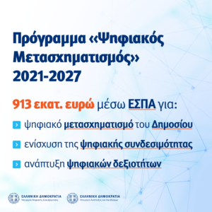 Εγκρίθηκε από την Ευρωπαϊκή Επιτροπή το Επιχειρησιακό Πρόγραμμα (ΕΠ) «Ψηφιακός Μετασχηματισμός» συνολικού προϋπολογισμού 913 εκατ. ευρώ, το οποίο σχεδιάστηκε στο πλαίσιο του ΕΣΠΑ 2021-2027, με στόχο «μια εξυπνότερη Ευρώπη μέσω της προώθησης του καινοτόμου και έξυπνου οικονομικού μετασχηματισμού, καθώς και της περιφερειακής ψηφιακής διασυνδεσιμότητας».