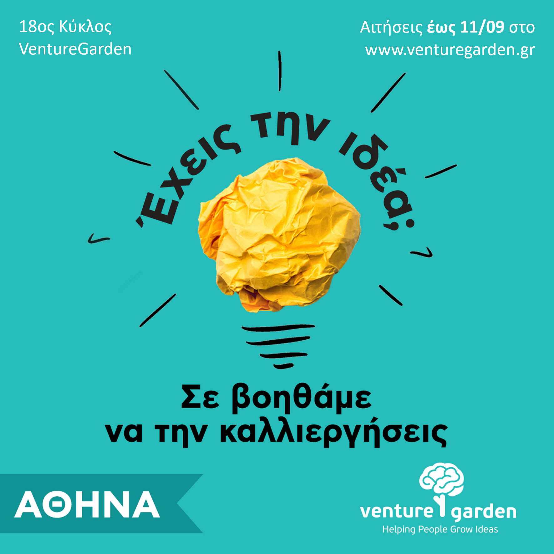 Ξεκίνησαν οι αιτήσεις για τον 18ο κύκλο του προγράμματος VentureGarden στην Αθήνα. Το VentureGarden Αθήνα είναι ένας επιταχυντής επιχειρηματικών ιδεών αρχικού σταδίου (idea accelerator).