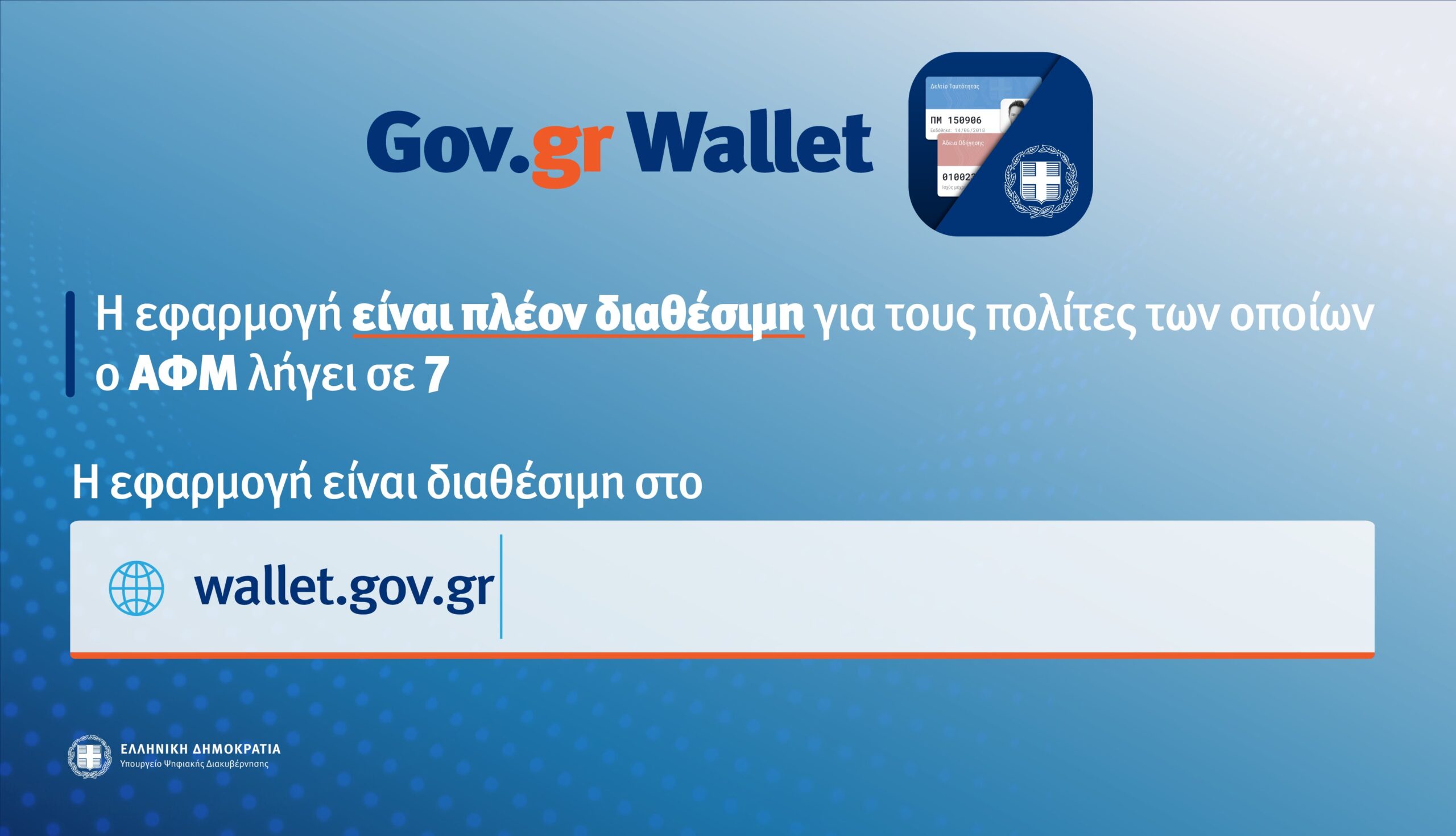Η πλατφόρμα https://wallet.gov.gr τέθηκε πλέον σε λειτουργία και για τους πολίτες των οποίων το ΑΦΜ τελειώνει σε 7 και οι οποίοι επιθυμούν να ενεργοποιήσουν το ψηφιακό δελτίο ταυτότητας ή/και το ψηφιακό δίπλωμα οδήγησης.