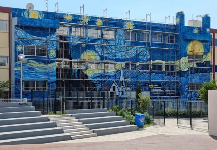 Οι δήμοι της Αττικής δεν βάζουν μόνο τις εργασίες, βάζουν και τη φαντασία των ανθρώπων τους, προκειμένου να κάνουν αισθητικά πιο όμορφα τα σχολεία και κατ’ επέκταση πολύ πιο ευχάριστη την έλευση των μαθητών. Η φαντασία φέρνει την έμπνευση, η έμπνευση με τη σειρά της φέρνει τη δημιουργία και κάπως έτσι ο δήμος Αλίμου «έντυσε» ολόκληρη τη μία όψη του 2ου Λυκείου με την «Έναστρη Νύχτα» του Βίνσεντ Βαν Γκογκ. Η πιστή αναπαραγωγή του διάσημου ζωγραφικού πίνακα, έγινε με το χέρι από τους καλλιτέχνες SpyLex Design.