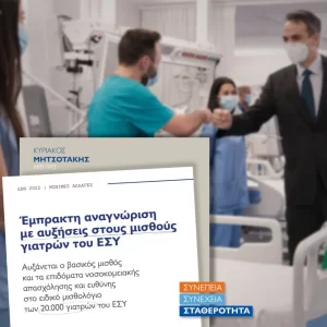 - Αναμορφώνουμε από 1/1/2023 το ειδικό μισθολόγιο των ΕΣΥ με αύξηση του βασικού μισθού και των επιδομάτων ευθύνης, υπολογίζεται σε 10% στο σύνολο των αποδοχών. Η αύξηση μεσοσταθμικά της τάξης του 10% επί του συνόλου των αποδοχών τους.