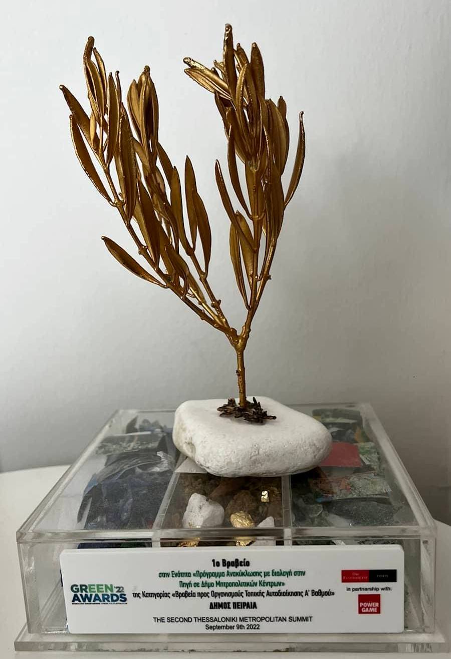 Το 1ο βραβείο για τις δράσεις που υλοποιεί στον τομέα της ανακύκλωσης απονεμήθηκε στον Δήμο Πειραιά στα Green Awards, τα οποία πραγματοποιήθηκαν στο Βελλίδειο Μέγαρο πριν από την έναρξη της ΔΕΘ, στο πλαίσιο του «The Second Thessaloniki Metropolitan Summit», που διοργάνωσαν ο Economist και το powergame.gr.