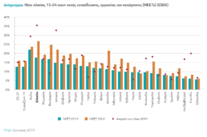 Όπως κι αν το δει κανείς, τα νούμερα περιγράφουν μια απογοητευτική εικόνα. Είναι γνωστά: η Ελλάδα είναι 24η στην ΕΕ ως προς τις ψηφιακές δεξιότητες του ανθρώπινου δυναμικού και 32η στις 33 χώρες του ΟΟΣΑ ως προς το ποσοστό συμμετοχής του ανθρώπινου δυναμικού σε προγράμματα κατάρτισης. Το ποσοστό ανεργίας στη χώρα μας παραμένει εξαιρετικά υψηλό (στο 17,3% το 2019 από 27,5% το 2013 αλλά από 7,8% το 2008) ενώ στους νέους η ανεργία (35,2% το 2019) είναι υπερδιπλάσια του μέσου όρου της ΕΕ. Παρ’ όλα αυτά, σε έρευνα του ΣΕΒ (2020) το 42,6% των επιχειρήσεων δηλώνουν ότι δυσκολεύονται να καλύψουν κενές θέσεις εργασίας μεσαίου επιπέδου, λόγω έλλειψης δεξιοτήτων και προϋπηρεσίας από το διαθέσιμο δυναμικό. Την προηγούμενη δεκαετία σχεδόν μισό εκατομμύριο εργαζόμενοι -κυρίως μορφωμένοι νέοι- έφυγαν στο εξωτερικό. Η Ελλάδα έχει ένα από τα υψηλότερα ποσοστά NEETs, -δηλαδή νέων που δεν εργάζονται ούτε εκπαιδεύονται- στην ΕΕ (12,5% το 2019). Μολονότι η Ελλάδα είναι κοντά στον μέσο όρο της ΕΕ στο ποσοστό πολιτών με τριτοβάθμια εκπαίδευση, είμαστε τελευταίοι στον Ευρωπαϊκό Δείκτη Δεξιοτήτων (μαζί με την Ισπανία).