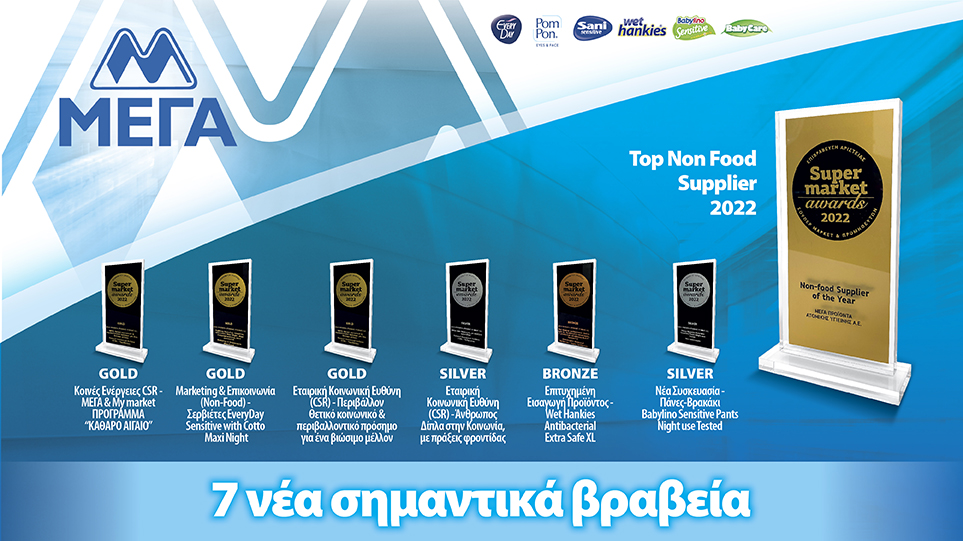 Επτά νέες σημαντικές διακρίσεις παρέλαβε η 100% ελληνική εταιρεία ΜΕΓΑ Προϊόντα Ατομικής Υγιεινής Α.Ε., στη λαμπρή τελετή απονομής των φετινών Supermarket Awards 2022, παρουσία σημαντικών θεσμικών εκπροσώπων, αλλά και διακεκριμένων στελεχών επιχειρήσεων του Ελληνικού Λιανεμπορίου.