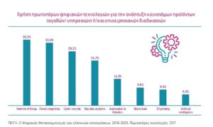 Όσον αφορά την ανάπτυξη καινοτόμων προϊόντων και διαδικασιών, οι κυριότερες τεχνολογίες που χρησιμοποιήθηκαν την περίοδο 2018-2020 αφορούν τις τεχνολογίες διαδικτύου των πραγμάτων (internet of things) (35,5%), τις τεχνολογίες υπολογιστικού νέφους (cloud computing) (33,8%), τις τεχνολογίες κυβερνοασφάλειας (cyber security) (29,2%) και τις τεχνολογίες ανάλυσης μαζικών δεδομένων (big data analytics) (24,2%).