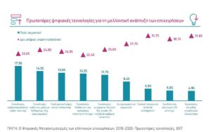 Όσον αφορά τη σημασία των πρωτοπόρων τεχνολογιών για την ανάπτυξη των επιχειρήσεων στο μέλλον, ως σημαντικότερες αναδεικνύονται οι τεχνολογίες κυβερνοασφάλειας (cyber security) (17,0%), οι τεχνολογίες ανάλυσης μαζικών δεδομένων (big data analytics) (14,5%), οι τεχνολογίες υπολογιστικού νέφους (cloud computing) (13,6%), οι τεχνολογίες διαδικτύου των πραγμάτων (internet of things) (13,2%) και οι τεχνολογίες 5G (12,7%).