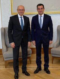 Οι Υπουργοί συζήτησαν την εμβάθυνση της διμερούς συνεργασίας Ελλάδας – Αζερμπαϊτζάν στον τομέα του φυσικού αερίου, στο πλαίσιο της ευρωπαϊκής στρατηγικής για τον διπλασιασμό της δυναμικότητας του Νοτίου Διαδρόμου κατά 10 δισ. κυβικά μέτρα το χρόνο, μετά το 2027.