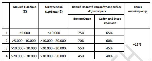 | Κατηγορία | Ατομικό Εισόδημα (€) σκέλος «Εξοικονομώ» | Οικογενειακό Εισόδημα (€) σκέλος «Εξοικονομώ» | Ατομικό, ή Οικογενειακό (€) σκέλος «Ανακαινίζω» |