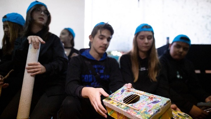 Με την καθοδήγηση της μουσικού Ελενας Χατζηκωνσταντίνου και της καθηγήτριας αγγλικών Μαίρης Δημητρακοπούλου, οι μαθητές και οι μαθήτριες του 3ου Γυμνασίου Ελευθερίου – Κορδελιού χρησιμοποίησαν ανακυκλώσιμα υλικά ώστε να φτιάξουν μια ορχήστρα! Έτσι, σε υαλόφωνα μετατράπηκαν γυάλινα μπουκάλια με συγκεκριμένες ποσότητες νερού χρωματισμένου με γκοφρέ, αλουμινένια κουτάκια έγιναν τύμπανα, όργανα βροχής δημιουργήθηκαν με ένα μακρύ κουτί από αφίσα και πλαστικά μπουκάλια, γεμισμένα με μια χούφτα ρύζι και όστρακα, σε μελωδό μεταμορφώθηκαν σωλήνες αλουμινίου πιασμένες με σκοινί σε ένα ξύλο. Μεταλλικά καπάκια που δέθηκαν μεταξύ τους έφτιαξαν ένα σείστρο, ένα κουτί παπουτσιών με περασμένα λάστιχα έγινε κιθάρα και πολλά κουτάκια που περιείχαν φιλμ, έγιναν μια περίτεχνη μαράκα.