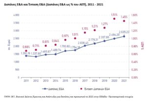 Αναλυτικότερα, το 2021, οι δαπάνες που πραγματοποιήθηκαν για Ε&Α στην Ελλάδα ήταν 2.635,23 εκατ. ευρώ, αυξημένες κατά 141 εκατ. ευρώ σε σχέση με το 2020 (ποσοστό αύξησης 5,7%). Σε συνδυασμό με την αύξηση, κατά 9,8%, του ΑΕΠ στην Ελλάδα το 2021, ο δείκτης “Ένταση Ε&Α”, που εκφράζει τις δαπάνες Ε&Α ως ποσοστό του ΑΕΠ, διαμορφώθηκε σε 1,45% από 1,51% το 2020.