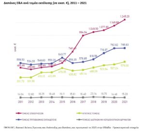 Αύξηση των δαπανών Ε&Α καταγράφεται επίσης στον κρατικό τομέα, όπου πραγματοποιήθηκαν δαπάνες Ε&Α ύψους 579,00 εκατ. ευρώ (0,32% του ΑΕΠ), αυξημένες κατά 7,8% σε σχέση με το 2020.