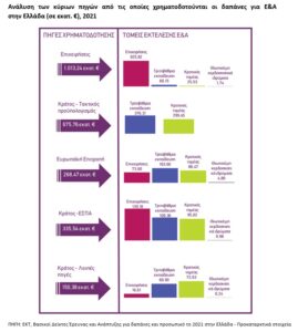 Όσον αφορά τις πηγές από τις οποίες χρηματοδοτήθηκαν οι δαπάνες Ε&Α, το 2021 το κράτος αποτελεί τη μεγαλύτερη πηγή χρηματοδότησης με 1.161,68 εκατ. ευρώ. Σημαντική αύξηση σημειώθηκε στις δαπάνες E&A που χρηματοδοτήθηκαν από το κράτος μέσω του ΕΣΠΑ 2014-2020. Αναλυτικότερα, η χρηματοδότηση από το ΕΣΠΑ ήταν συνολικά 335,54 εκατ. ευρώ (αύξηση 33,50%) και αφορούσε όλους τους τομείς: τις επιχειρήσεις (139,18 εκατ. ευρώ), τον τομέα τριτοβάθμιας εκπαίδευσης (100,36 εκατ. ευρώ), τον κρατικό τομέα (95,02 εκατ. ευρώ) και τον τομέα ιδιωτικών μη κερδοσκοπικών ιδρυμάτων (0,98 εκατ. ευρώ).