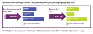 Η αύξηση των δαπανών Ε&Α το 2021 είχε ως αποτέλεσμα την αύξηση στην απασχόληση σε δραστηριότητες Ε&Α. Ο αριθμός των Ισοδυνάμων Πλήρους Απασχόλησης (ΙΠΑ), που αποδίδουν “θέσεις” πλήρους απασχόλησης, σε σχέση με το 2020, αυξήθηκε κατά 4,2% για το συνολικό προσωπικό σε Ε&Α και κατά 3,2% για τους ερευνητές. Το συνολικό προσωπικό σε Ε&Α το 2021 ανέρχεται σε 60.537 θέσεις πλήρους απασχόλησης (ΙΠΑ) και οι ερευνητές σε 44.317 ΙΠΑ. Η μεγαλύτερη αύξηση καταγράφεται στον τομέα των επιχειρήσεων.