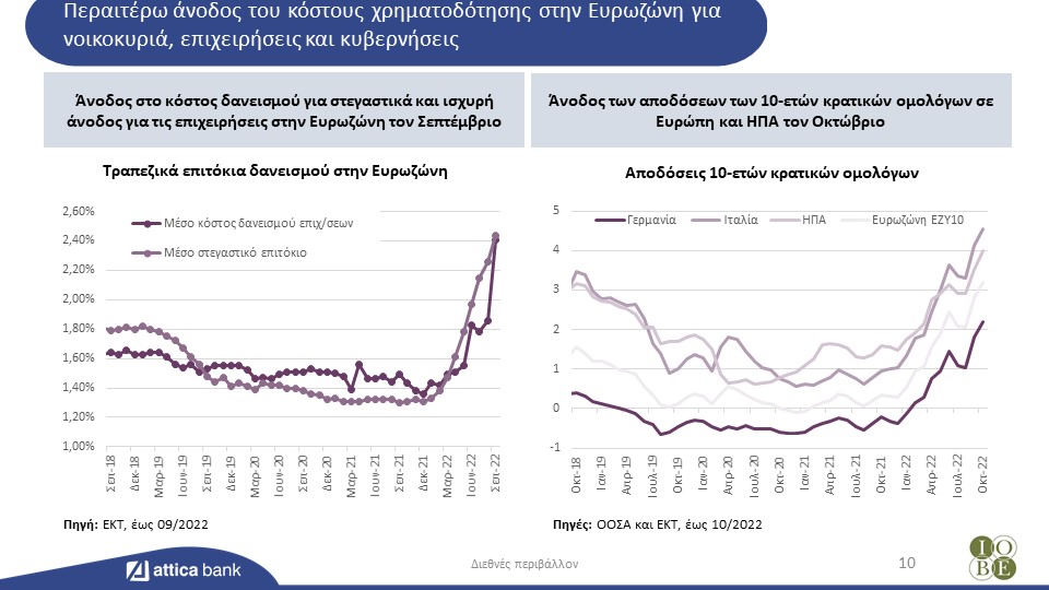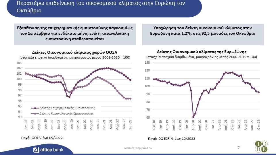 Οι νομισματικές αρχές επιταχύνουν την αύξηση του κόστους χρήματος προκειμένου να καμφθούν οι επίμονες πληθωριστικές πιέσεις. Το οικονομικό κλίμα επιδεινώθηκε περαιτέρω στην Ευρώπη τον Οκτώβριο, ενώ πτωτικά κινήθηκαν τον Σεπτέμβριο και οι παγκόσμιοι δείκτες καταναλωτικής εμπιστοσύνης και επιχειρηματικών προσδοκιών. Οι διεθνείς τιμές ενεργειακών αγαθών συνέχισαν να κυμαίνονται σε πολύ υψηλά επίπεδα τον Οκτώβριο, παρά την σημαντική κάμψη στις τιμές του φυσικού αερίου, σε χαμηλά δωδεκαμήνου. Το ευρώ σημείωσε περαιτέρω πτώση έναντι του δολαρίου τον Οκτώβριο, σε νέα χαμηλά επίπεδα εικοσαετίας.